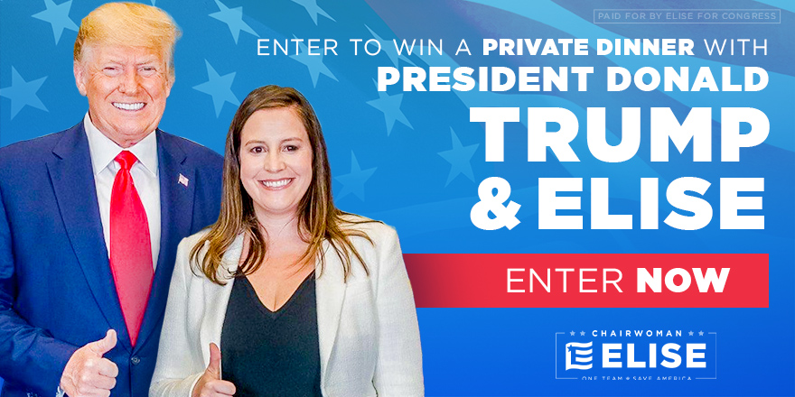 Enter to win a private dinner with Chairwoman Elise Stefanik and her good friend President Trump. The winner will dine with President Trump on January 11, 2022 at his home, Mar-Lago in Palm Beach, Florida.